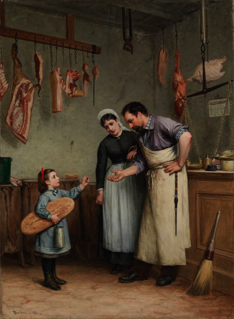 La saynète de l’enfant demandant des restes pour son chat est composée chez un commerçant de Maisons-Laffitte, et c’est une petite fille de la ville qui sert de modèle – peut-être la même que celle retenue par Albert Edelfelt. Les esquisses montrent que plusieurs fillettes d’âge différent ont tout d’abord été envisagées. Un voisin parisien de Becker, le sculpteur Paul Darfeuille, pose pour le boucher. Becker est réputé pour ces peintures attendrissantes, où l’attention est portée aux enfants. Exposé au Salon parisien de mai 1882, le tableau souligne la présence de Becker à Maisons-Laffitte dès avant l’été. Celui-ci devait retourner en Finlande en septembre, pour assurer les cours de peinture de son académie privée.