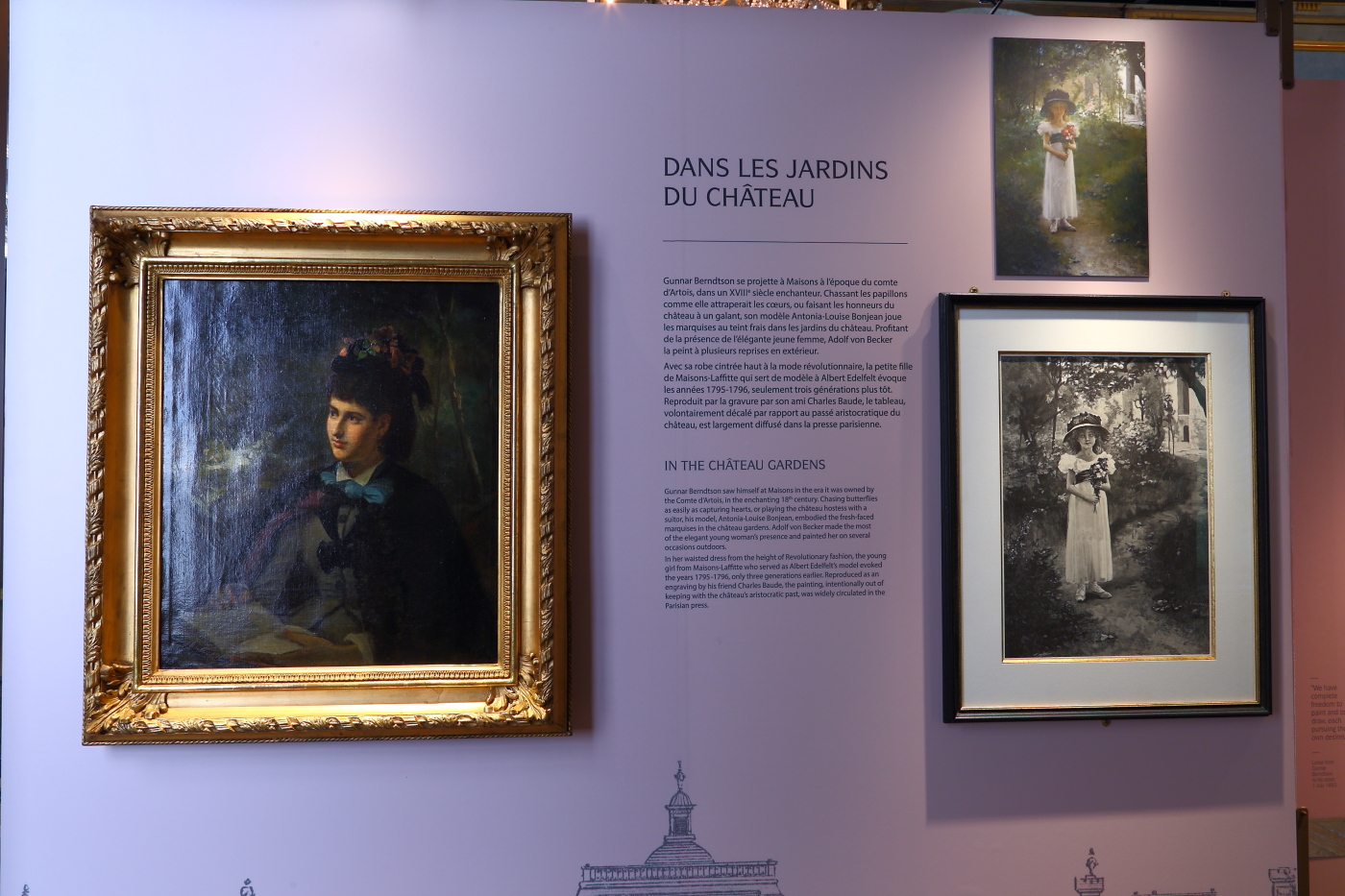 Gunnar Berndtson se projette à Maisons à l’époque du comte d’Artois, dans un XVIIIe siècle enchanteur. Chassant les papillons comme elle attraperait les cœurs, ou faisant les honneurs du château à un galant, son modèle Antonia-Louise Bonjean joue les marquises au teint frais dans les jardins du château. Profitant de la présence de l’élégante jeune femme, Adolf von Becker la peint à plusieurs reprises en extérieur.