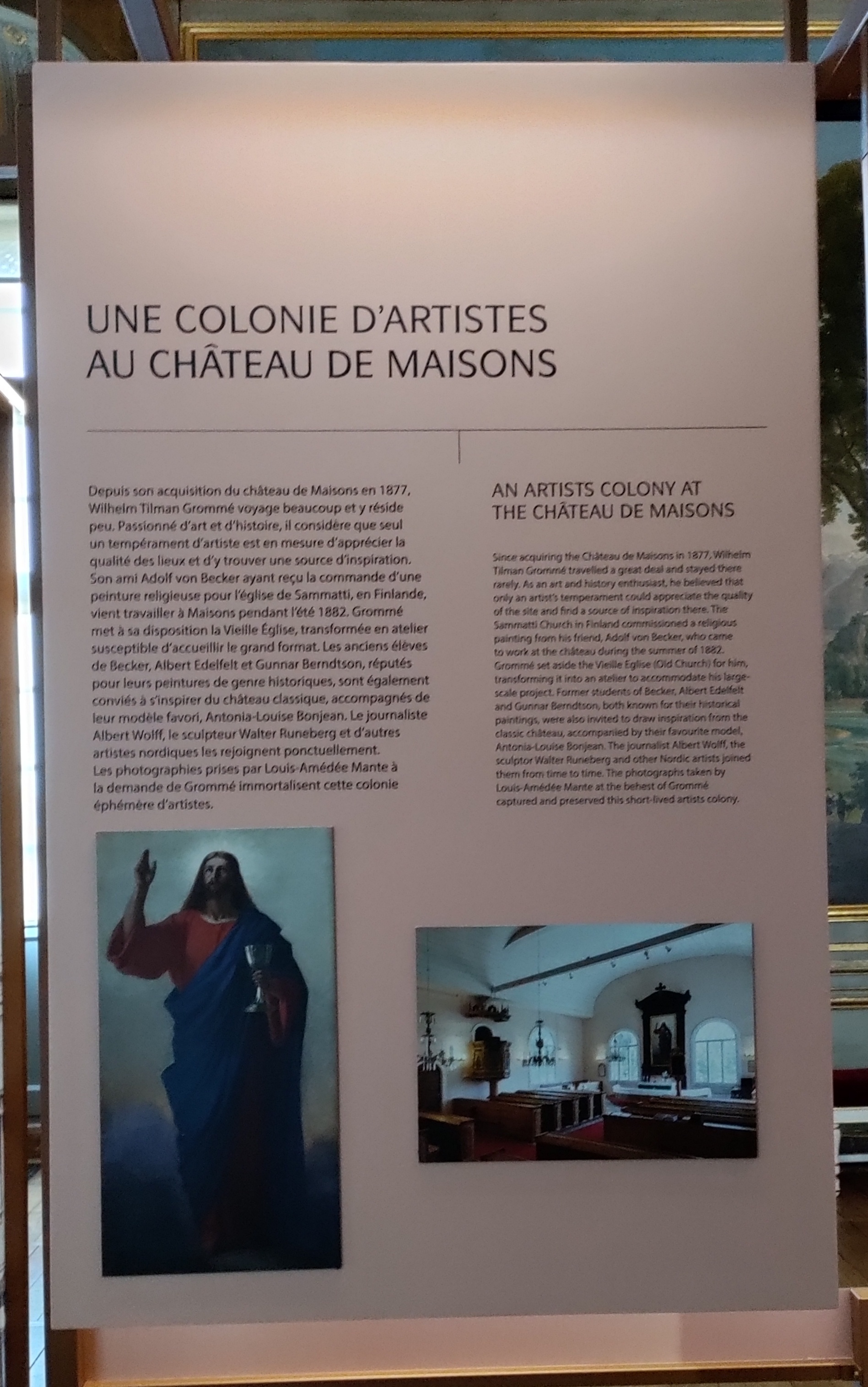 Depuis son acquisition du château de Maisons en 1877, Wilhelm Tilman Grommé voyage beaucoup et y réside peu. Passionné d’art et d’histoire, il considère que seul un tempérament d’artiste est en mesure d’apprécier la qualité des lieux et d’y trouver une source d’inspiration. Son ami Adolf von Becker ayant reçu la commande d’une peinture religieuse pour l’église de Sammatti, en Finlande, vient travailler à Maisons pendant l’été 1882. Grommé met à sa disposition la Vieille Église, transformée en atelier susceptible d’accueillir le grand format. Les anciens élèves de Becker, Albert Edelfelt et Gunnar Berndtson, réputés pour leurs peintures de genre historique, sont également conviés à s’inspirer du château classique, accompagnés de leur modèle favori, Antonia-Louise Bonjean. Le journaliste Albert Wolff, le sculpteur Walter Runeberg et d’autres artistes nordiques les rejoignent ponctuellement. Les photographies prises par Louis-Amédée Mante à la demande de Grommé immortalisent cette colonie éphémère d’artistes.