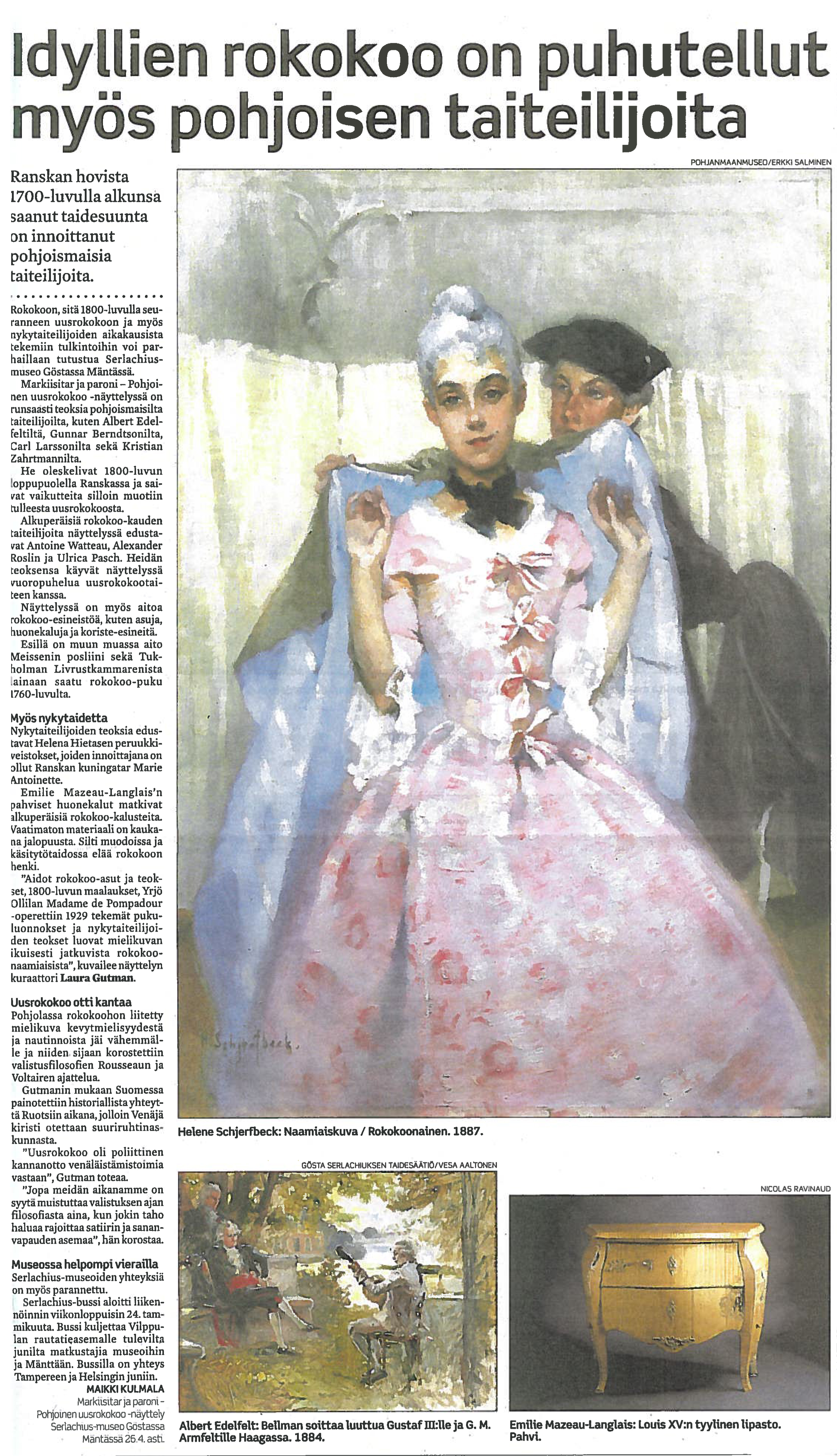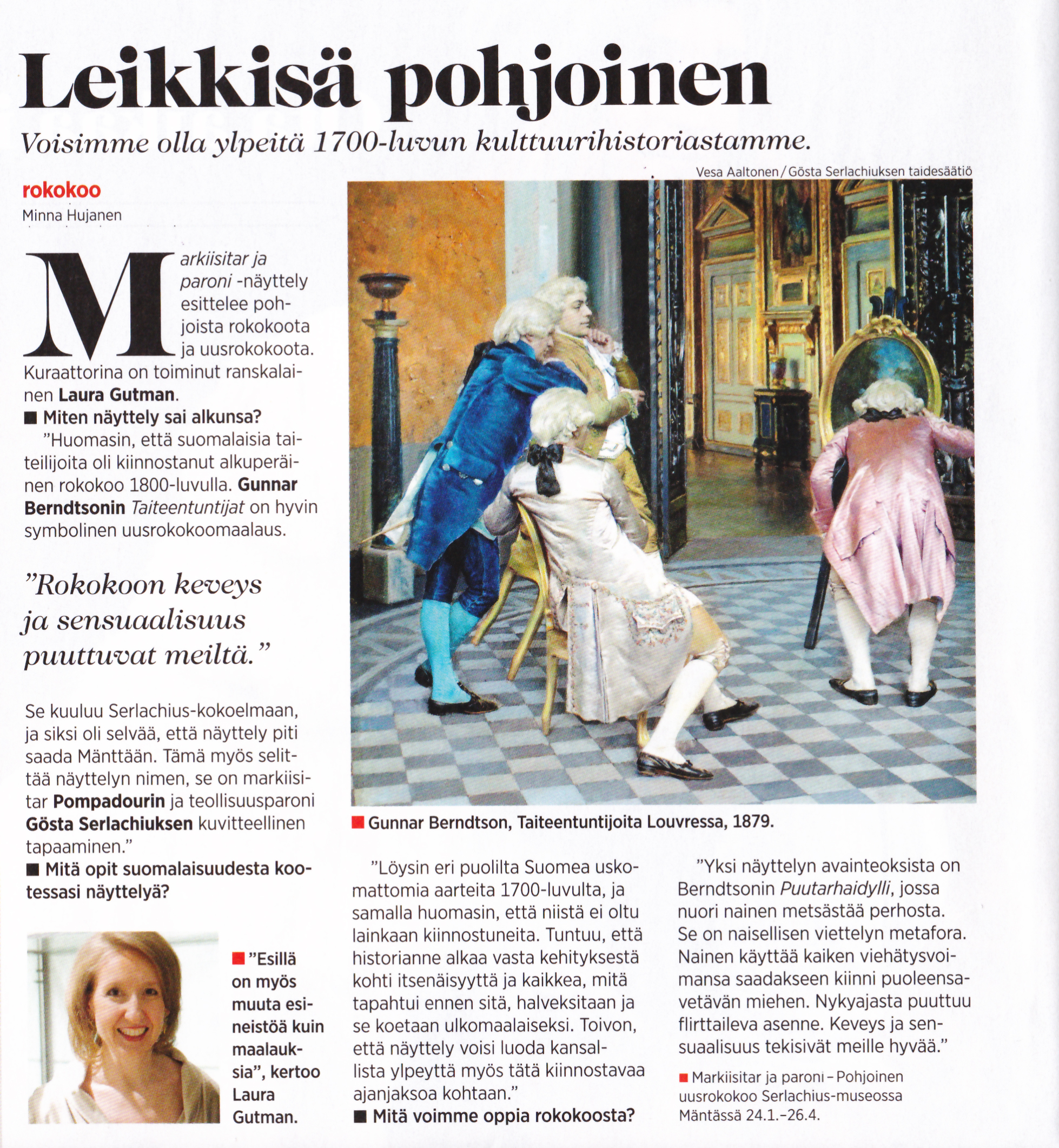 “The Neo-Rococo and the North” can be viewed at the Serlachius museum in Mänttä (wwww.serlachius.fi) until April 26th . Its trilingual velvet cover catalogue (in Finnish, Swedish and English) is conceived as a real book with numerous comparative illustrations from the rococo and Enlightenment eras, and can be ordered from the Akateeminen bookshop. www.akateeminen.com.