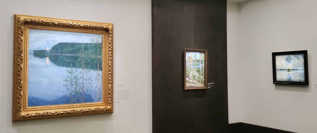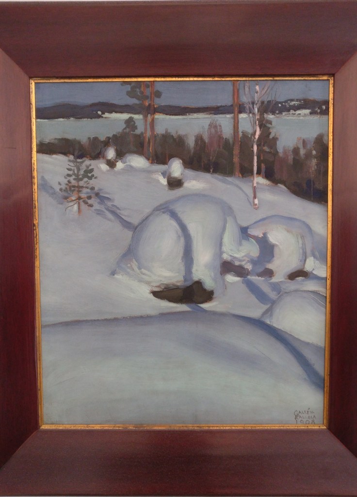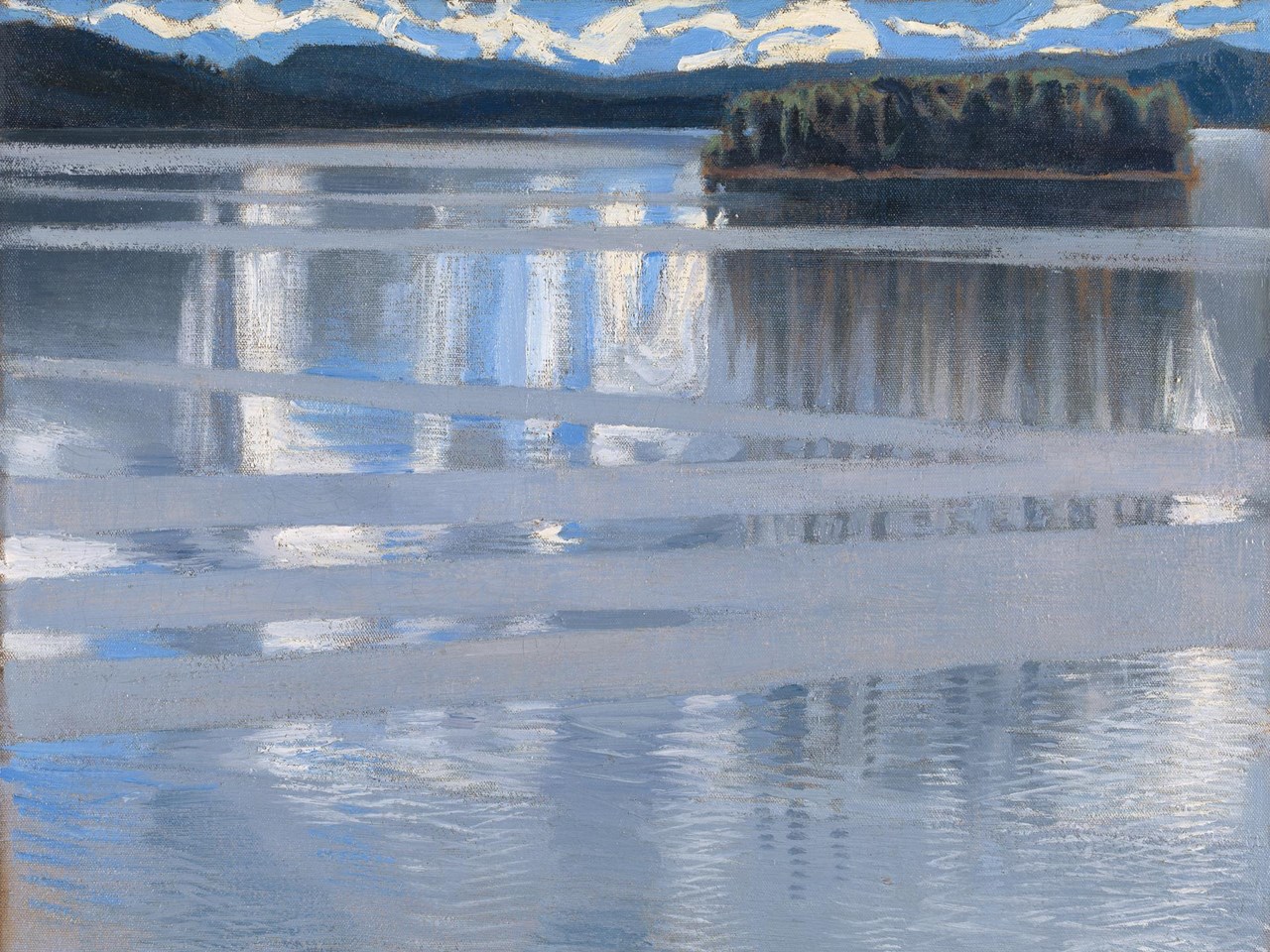 Akseli Gallen-Kallela préfère au paysage de l’archipel celui des lacs, à l’intérieur des terres de la Finlande. Le jeu des reflets du ciel dans l’eau renvoie à l’existence d’une dimension cachée, double du monde visible. L’intensité de la lumière et l’étendue des variations picturales éblouissent et transportent dans un paysage finlandais à la fois accessible et transmis avec un talent incomparable.
