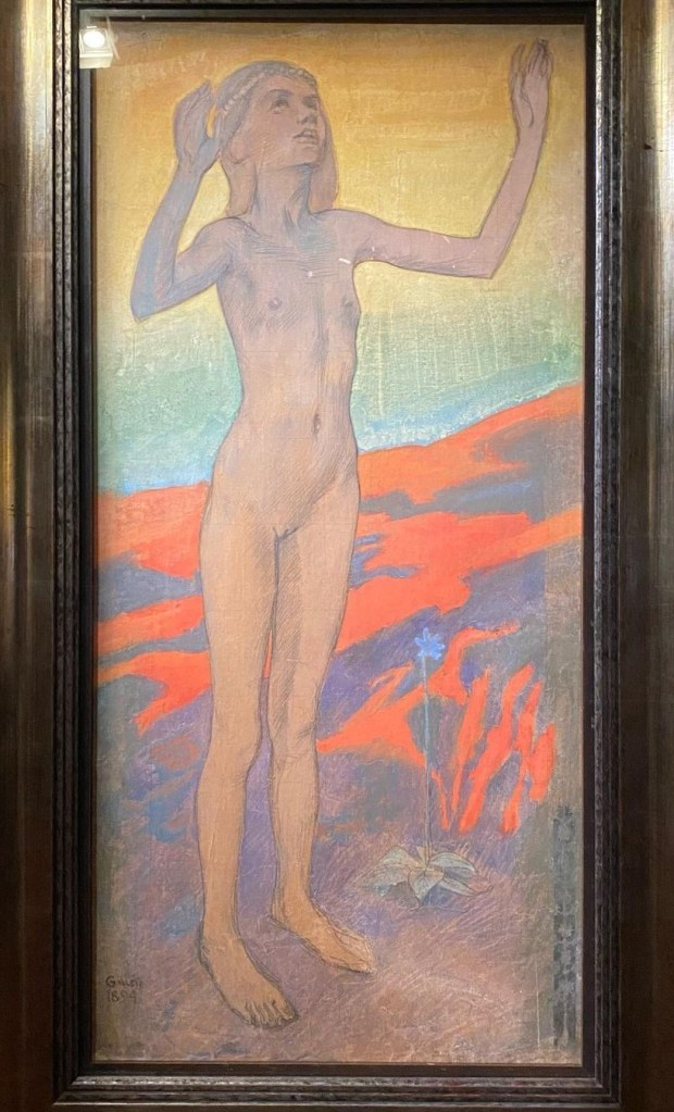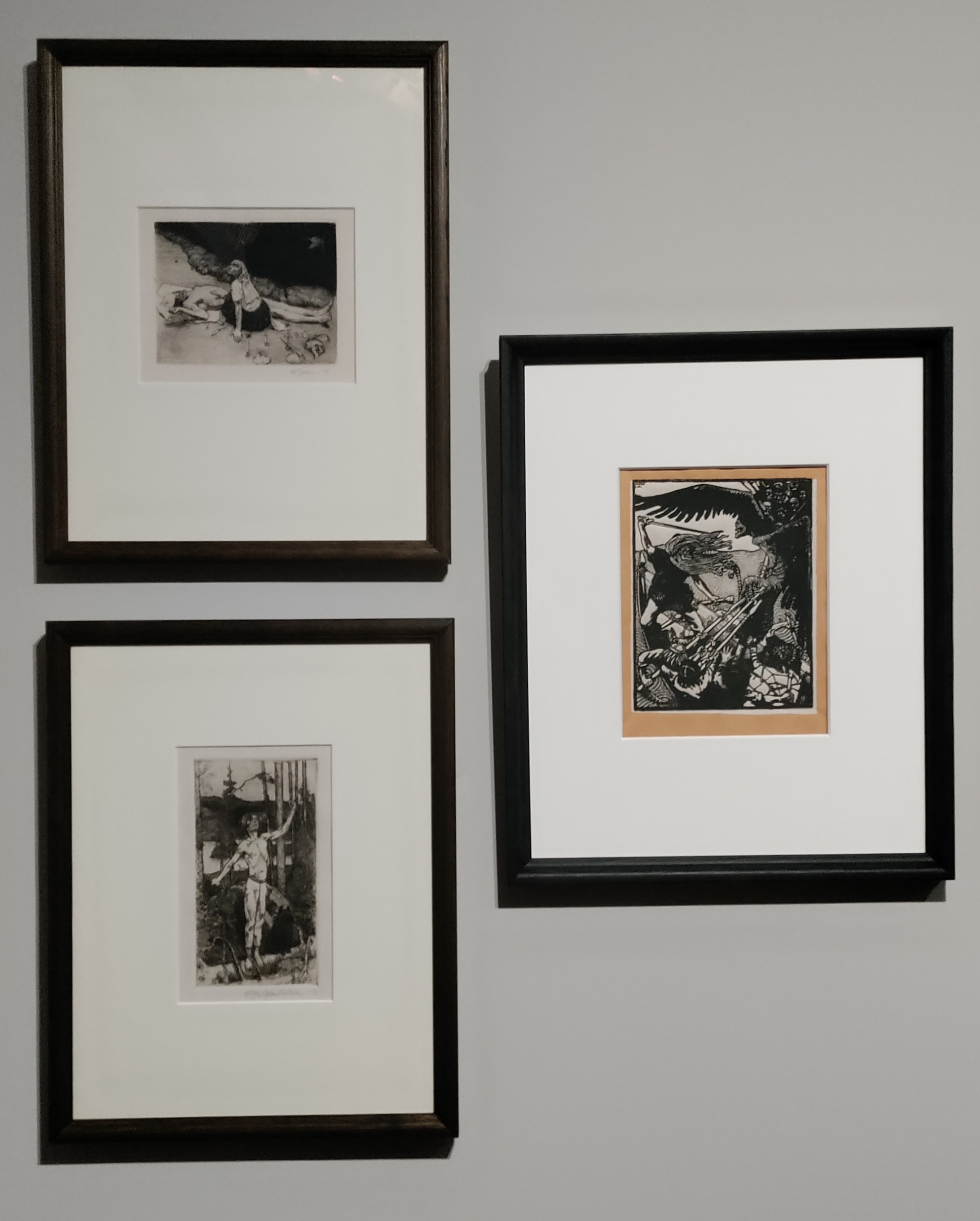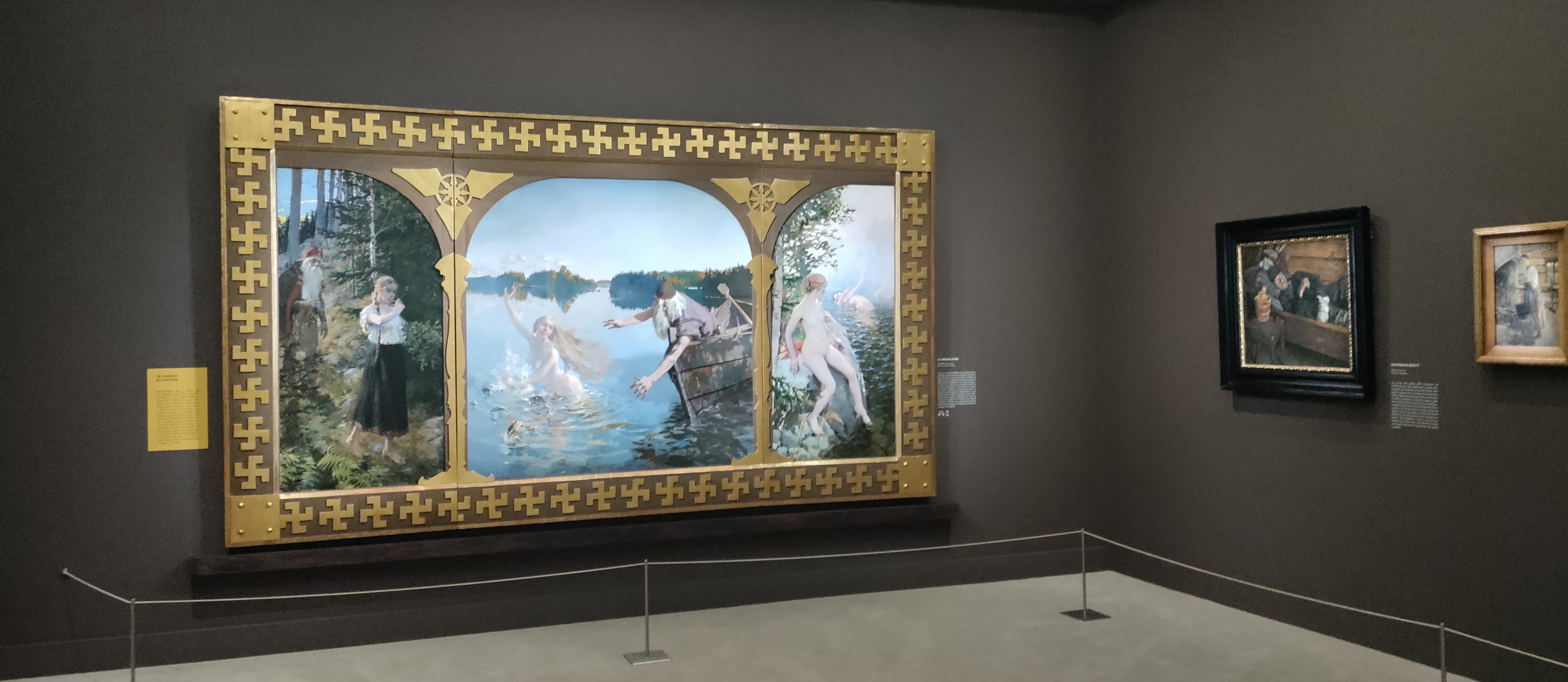 Lorsqu’il se saisit de la légende du Kalevala, les paysages finlandais se voient peuplés de figures mythologiques aux traits empruntés à la paysannerie locale. Le triptyque de La Légende d’Aïno, destiné à clore ses études artistiques à Paris avec une oeuvre majeure à l’Exposition universelle de 1889, est à ses yeux un échec – il renoncera à exposer son chef-d’œuvre à Paris. Il admet que l’utilisation d’un style naturaliste quasi-photographique ne convient pas à l’esprit légendaire du Kalevala.