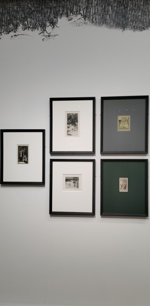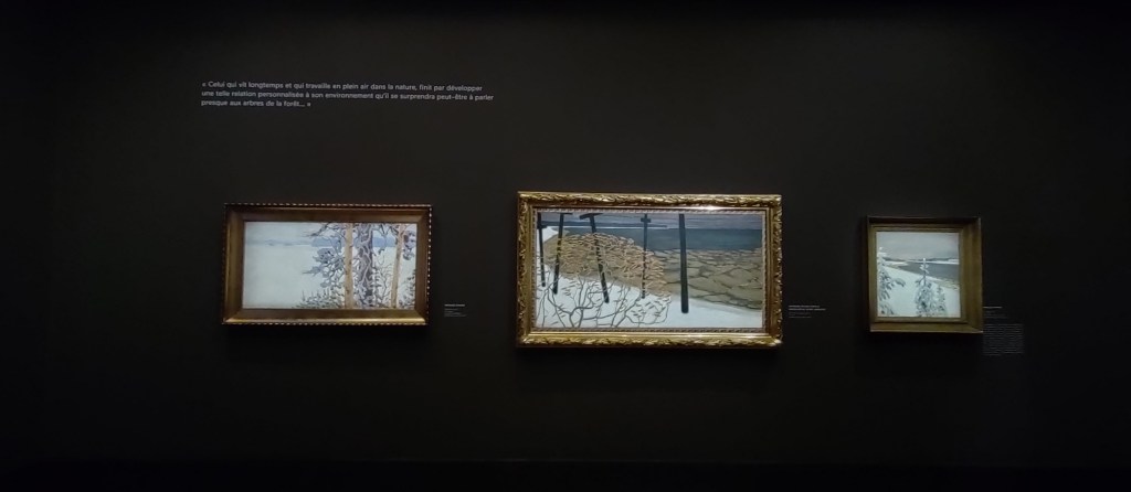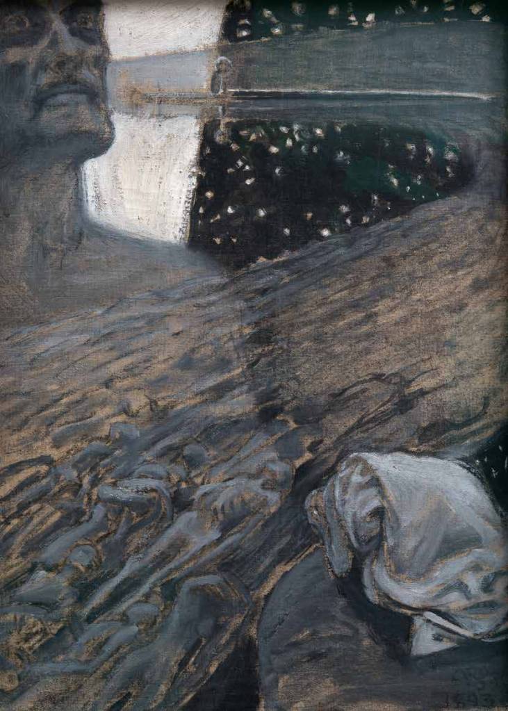 La relation du peintre Akseli Gallen-Kallela (1865-1931) à la nature finlandaise est au cœur de l’exposition. A ses débuts naturalistes, elle s’articule dans une association étroite des paysages et des paysans. Par l’usage d’une palette colorée bistre homogène, les figures se fondent dans leur environnement. Gallen-Kallela part à leur rencontre à l’intérieur des terres et donne une place essentielle aux paysans, intrinsèquement liés à leur terre.