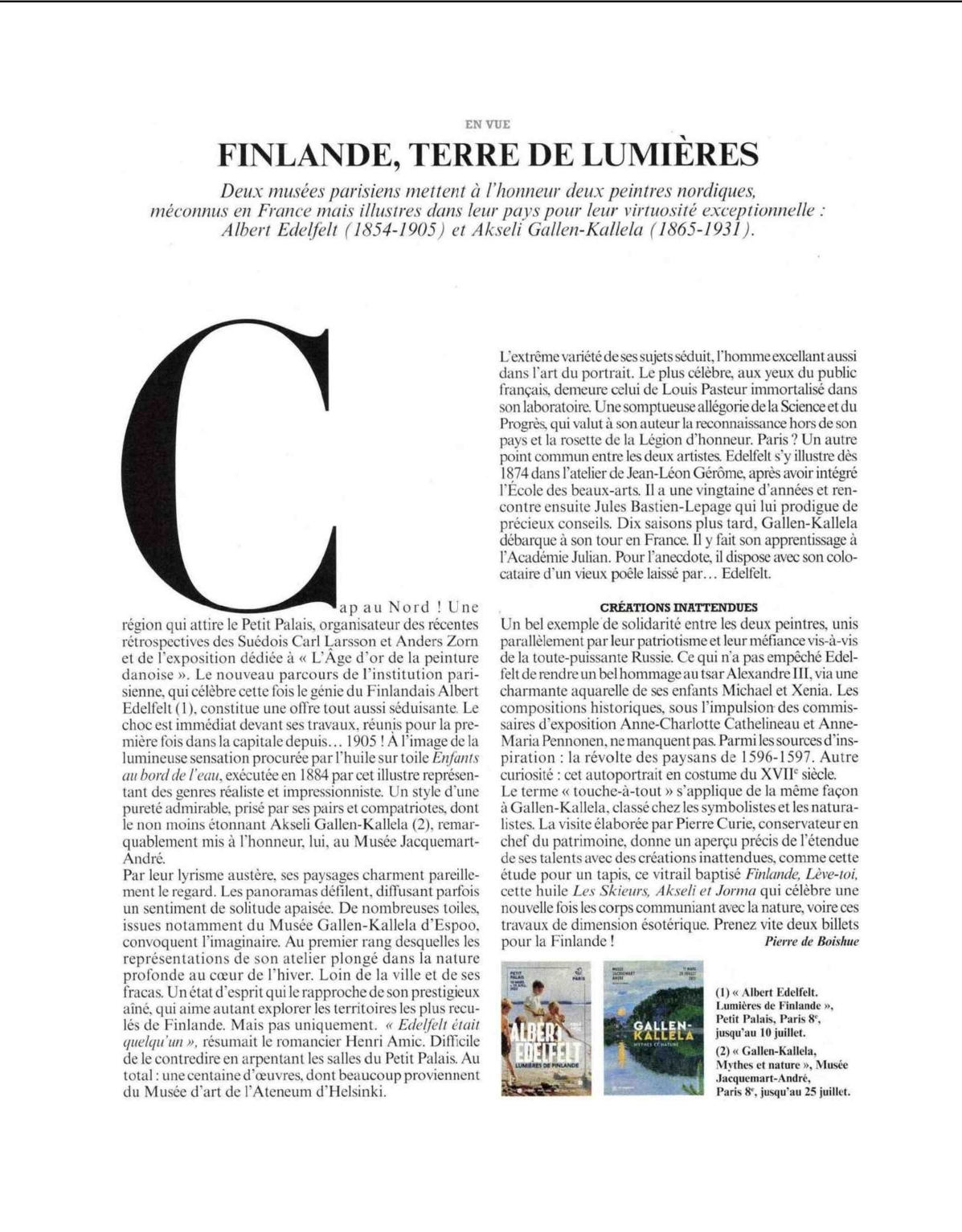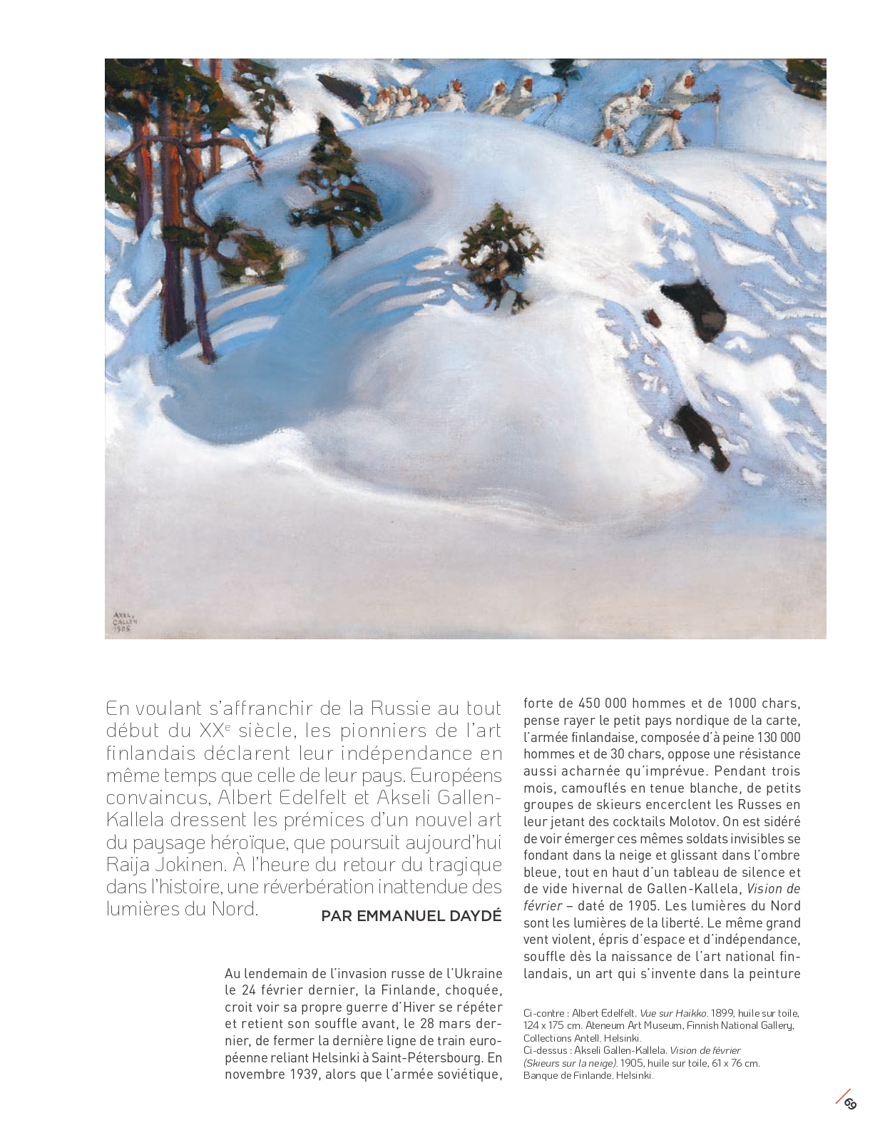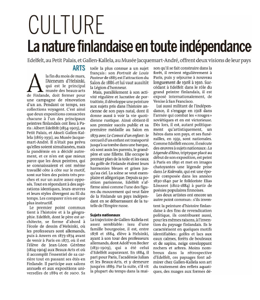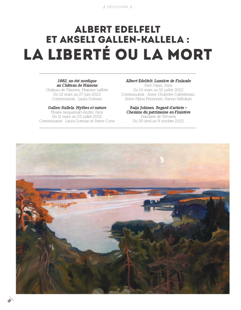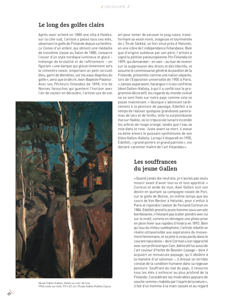 Est-il permis, par les rudes temps qui courent, de s’évader un instant à travers les forêts enneigées, les lacs étincelants de Finlande ? En fait, les expositions que le Petit Palais et le Musée Jacquemart-André à Paris consacrent simultanément aux peintres Albert Edelfelt et Akseli Gallen-Kallela résonnent étrangement avec l’actualité. Les deux artistes ont entamé leur carrière à la fin du XIX e siècle, à une époque où leur patrie, passée de la domination suédoise à celle de l’Empire russe, a aspiré à s’émanciper de ce joug, avant d’acquérir son indépendance à la faveur de la révolution de 1917. Chacun à sa manière, ils ont accompagné ce mouvement nationaliste en célébrant l’identité de leur territoire, tout en se nourrissant de culture européenne, notamment française…