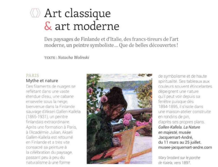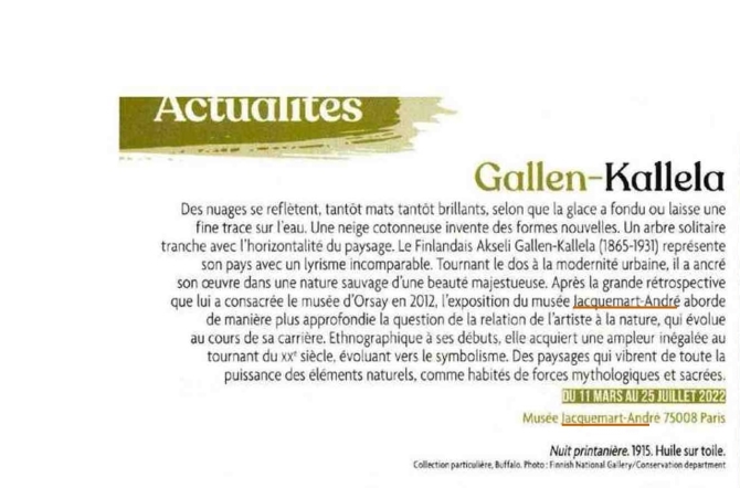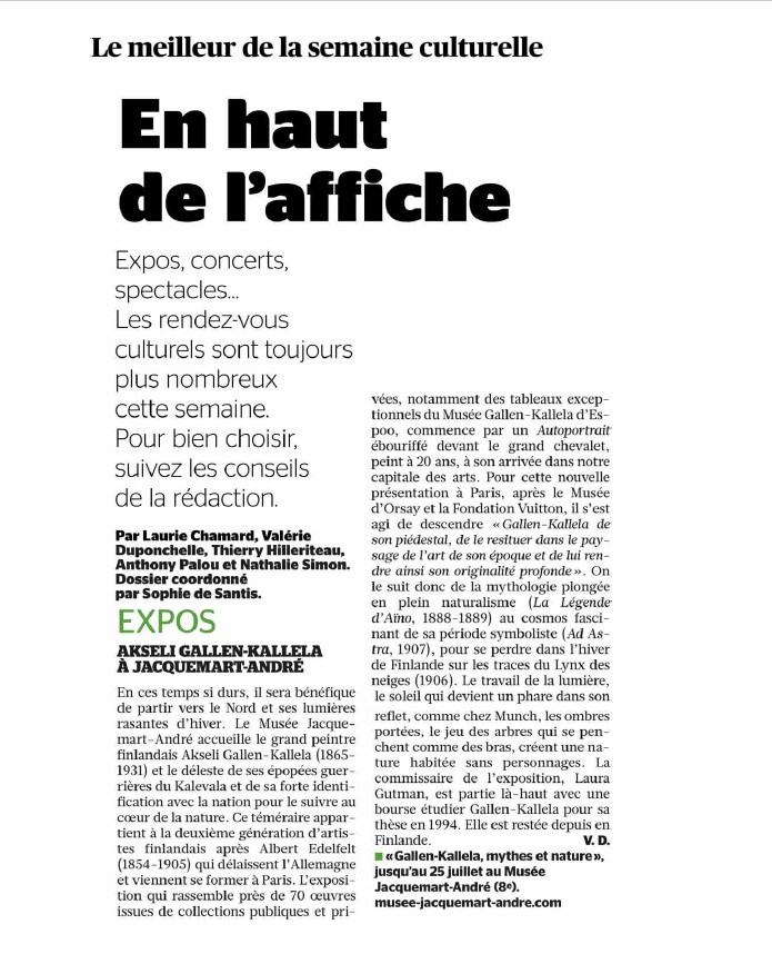 Au musée Jacquemart-André, le public est amené à découvrir jusqu’en juillet la grande diversité et l’originalité de l’oeuvre d’Axel Gallén alias Akseli Gallen-Kallela, un des artistes finlandais les plus connus du tournant du XXe siècle.