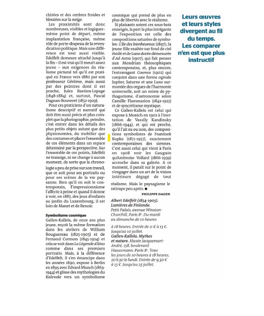 L’artiste influencera en retour son aîné Edelfelt, qui livrera aussi, à la fin de sa vie, des paysages intacts, cernés d’un trait sombre emprunté à Munch et à Gauguin. En 1900, Edelfelt invitera son ami avec d’autres compatriotes à exposer avec lui dans le pavillon finlandais de l’Exposition universelle de Paris. Commissaire général du projet, grâce à ses liens avec la Russie, il sollicitera l’architecte Eliel Saarinen, qui donne au pavillon la forme d’une église médiévale finnoise. Gallen-Kallela, lui, y réalisera des fresques sur