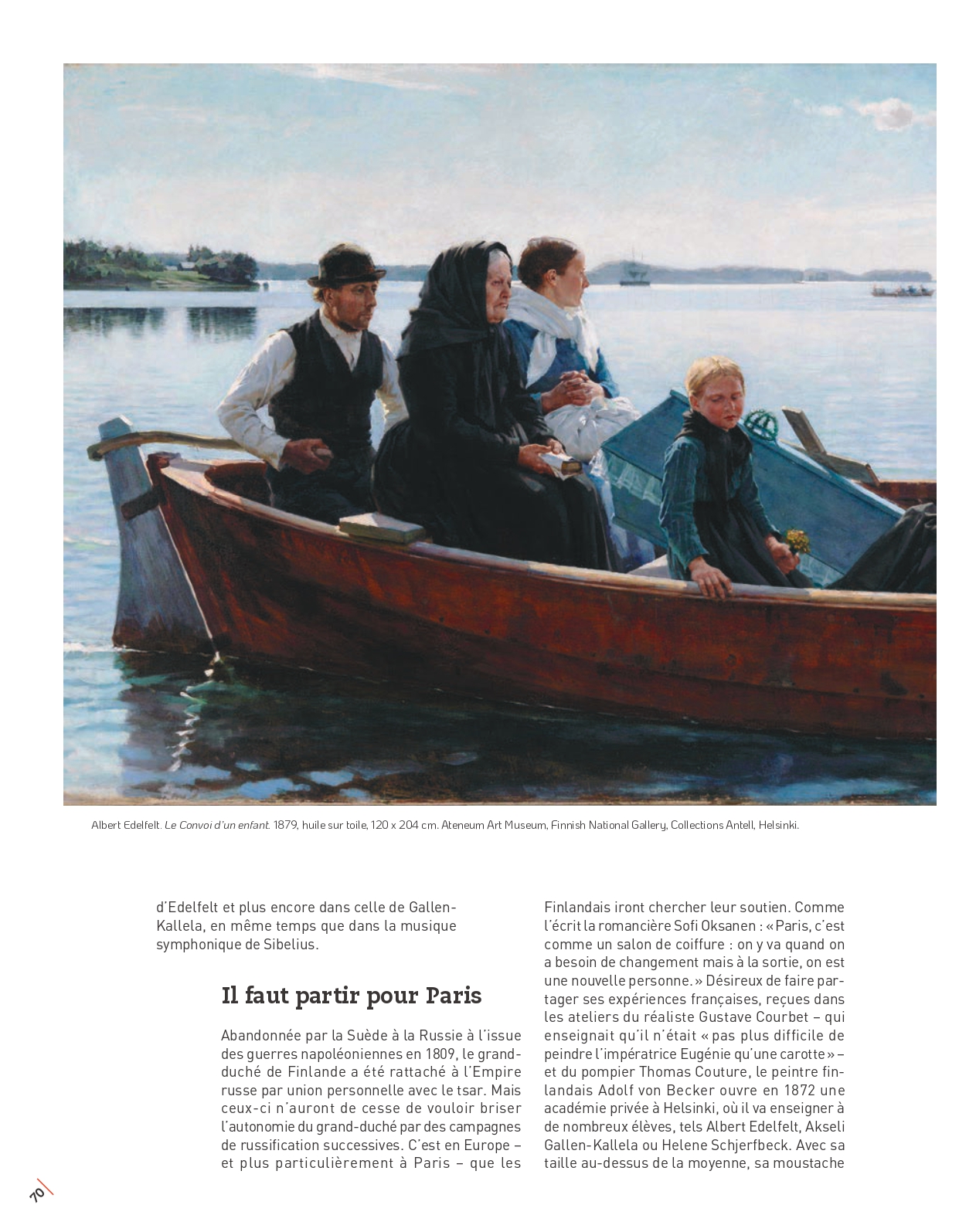 Né en 1854, Albert Edelfelt vient le premier se former à 20 ans à Paris, où il s’installe pour un quart de siècle, tout en retournant chaque été en Finlande. Après de premiers tableaux inspirés par l’histoire de sa terre natale, il bascule dans une veine naturaliste, sous l’influence de Jules Bastien-Lepage. Et il y entraîne son cadet Akseli Gallen-Kallela, qui débarque dans la capitale française en 1884. Homme de la côte sud de la Finlande, Edelfelt peint la vie âpre des pêcheurs, des petits apprentis tailleurs, les femmes à la sortie de l’église, une conteuse au regard inspiré…