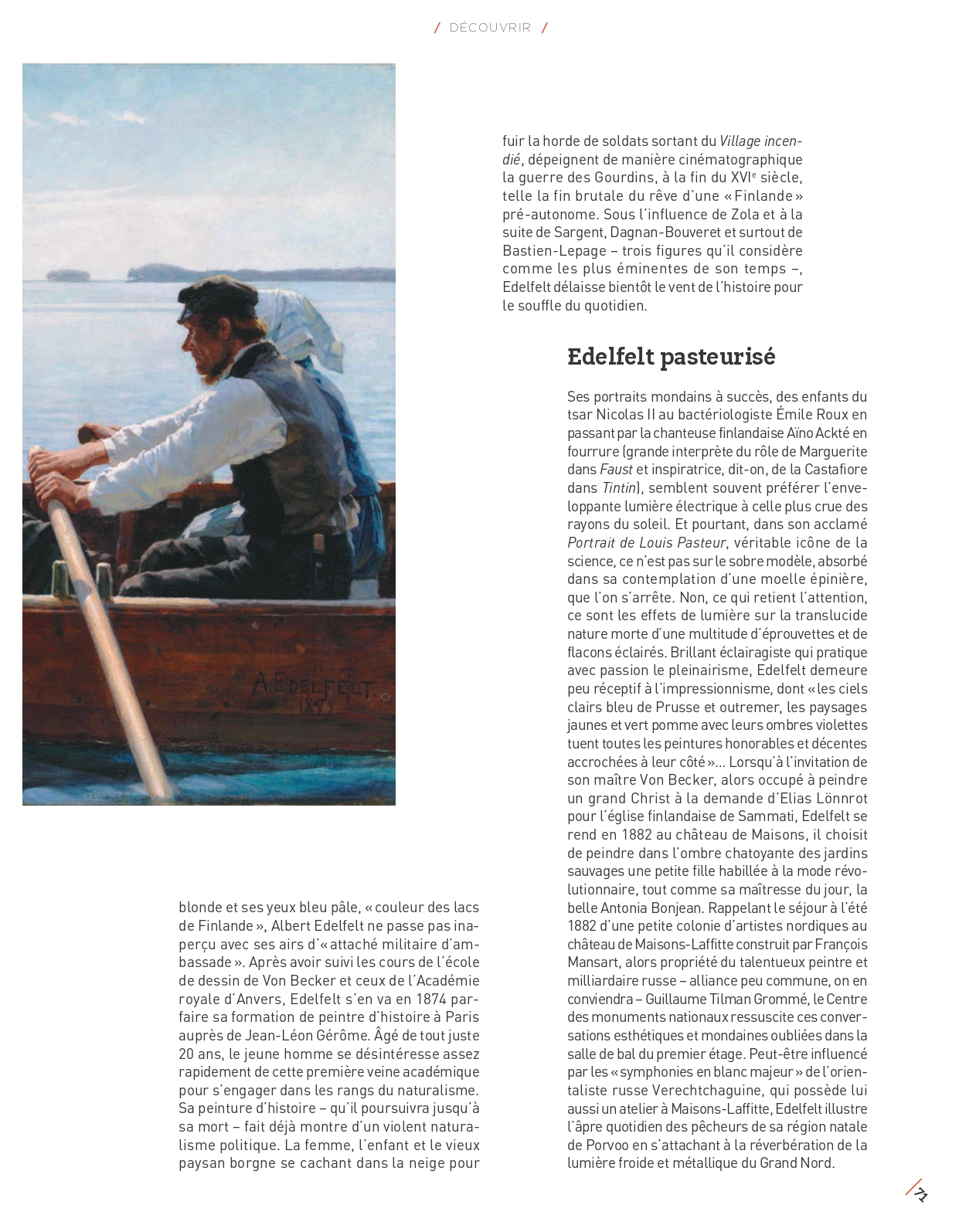 Bords de la Mer Baltique, forêts, lacs: l’exposition retrace le parcours de ce portraitiste, qui a peint aussi bien les habitants de son pays natal, des scènes d’histoire ou de la vie quotidienne traditionnelle finlandaise du bord de mer que des femmes et hommes célèbres comme Louis Pasteur, qu’il admirait.