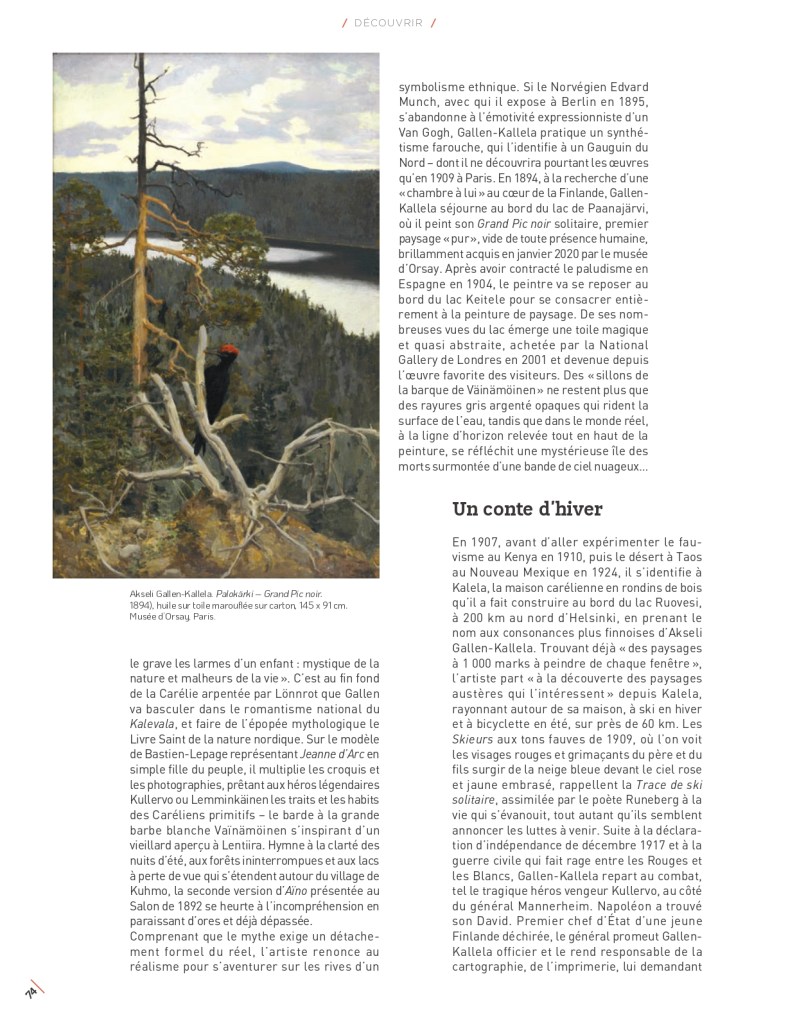Paris. Depuis deux ans, les visiteurs du Musée d’Orsay peuvent admirer une œuvre du peintre finlandais Akseli Gallen-Kallela (1865-1931), Le Grand Pic noir (1892-1894). L’oiseau à la crête rouge immergé dans le paysage grandiose du lac de Paanajärvi, en Carélie, fait figure de double du peintre profondément attaché à la nature finlandaise. C’est ce chantre de la mère-patrie que présente la commissaire Laura Gutman, qui a obtenu les prêts des institutions finlandaises pour cette exposition de près de soixante-dix œuvres et objets. Il ne s’agit pas, comme au Musée d’Orsay en 2012, d’une rétrospective mais d’une analyse de la personnalité de l’artiste à travers les paysages qu’il a peints. Et, si Le Grand Pic noir ne figure pas à l’exposition, le même oiseau y apparaît dans une œuvre très symbolique des préoccupations du peintre.