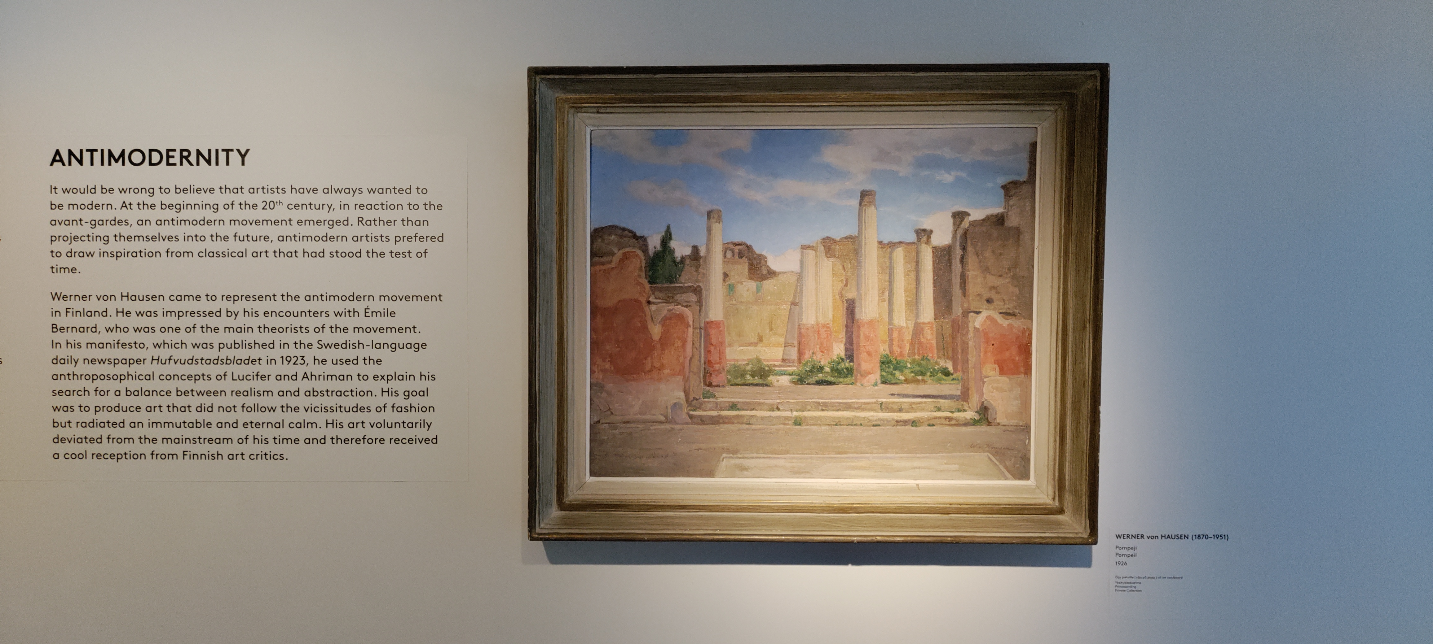 Werner von Hausen est le représentant du mouvement antimoderne en Finlande. Il a été marqué par ses rencontres avec Emile Bernard, l’un des principaux théoriciens du mouvement. Dans son manifeste publié dans le quotidien Hufvudstadtsbladet en 1923, il explique être à la recherche d’un équilibre poétique, éloigné tant du matérialisme de Lucifer que du spiritualisme d’Ahriman – selon la terminologie anthroposophique qu’il utilise. Il se donne pour objectif de produire un art qui ne cède pas aux injonctions de la mode et revendique un calme immuable et éternel. Se tenant volontairement à l’écart, son œuvre suscite l’incompréhension des critiques d’art finlandais.